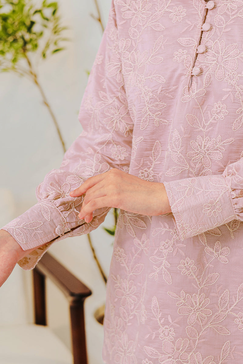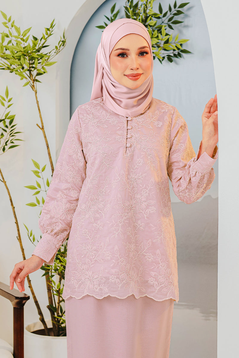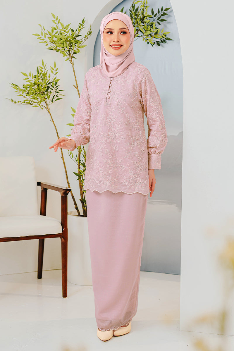 A graceful modern kurung showcasing delicate embroidery, combining elegance and comfort for Raya celebrations and special occasions.